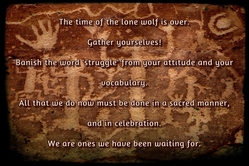 The meditation contains the following extract from a prophecy attributed to the Hopi tribes of northern Arizona. Their ‘End of the Fourth World‘ predictions of the life to come are not limited to the Hopi themselves but reflect impending events on a global scale. It describes an all-too-familiar scenario.