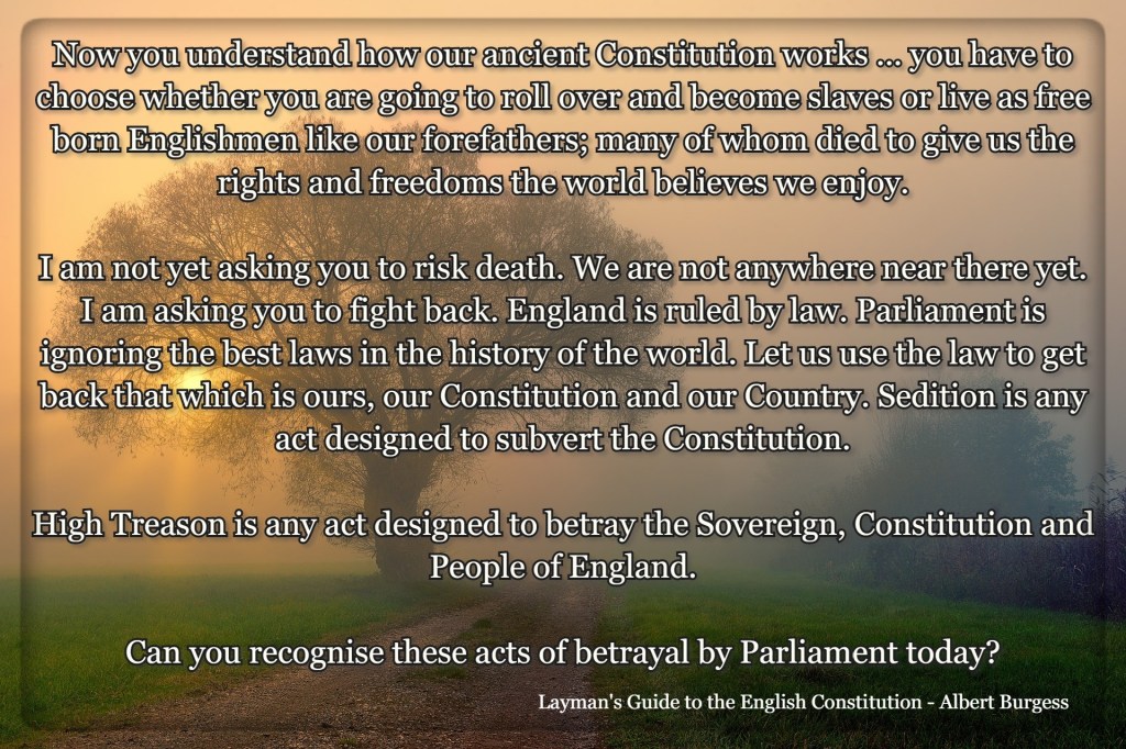 None of Westminster’s Acts, laws and mandates may impinge on our Constitutional rights and those bestowed by the English Bill of Rights of 1688/89. These include the right to protest peacefully and to worship according to our faith. These rights are sacrosanct. Any attempt by parliament – or any of its agencies – to violate them is itself an act of sedition.