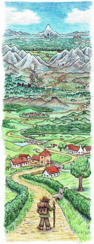 ‘Well, now we’re off at last!’ said Frodo. They shouldered their packs and took up their sticks, and walked round the corner to the west side of Bag End. ‘Good-bye!’ said Frodo, looking at the dark blank windows. He waved his hand, and then turned and (following Bilbo, if he had known it) hurried after Peregrin down the garden-path. They jumped over the low place in the hedge at the bottom and took to the fields, passing into the darkness like a rustle in the grasses.