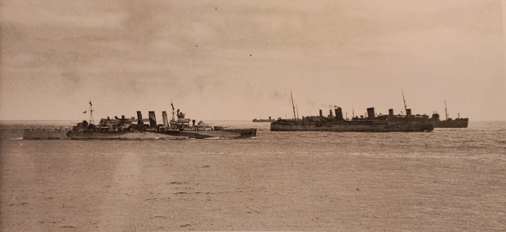 When my father joined the crew of Shropshire she had recently undergone a refit following operations in the South Atlantic. Refit completed, the ship then steamed to the Indian Ocean where she undertook convoy cover duties between Cape Town, Durban, Mombassa and Aden.