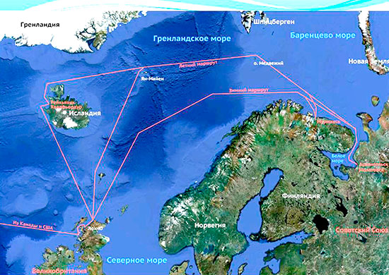 During the months when pack ice permitted, the convoys ran from Iceland, north to Jan Mayen island and on to the port of Archangel.