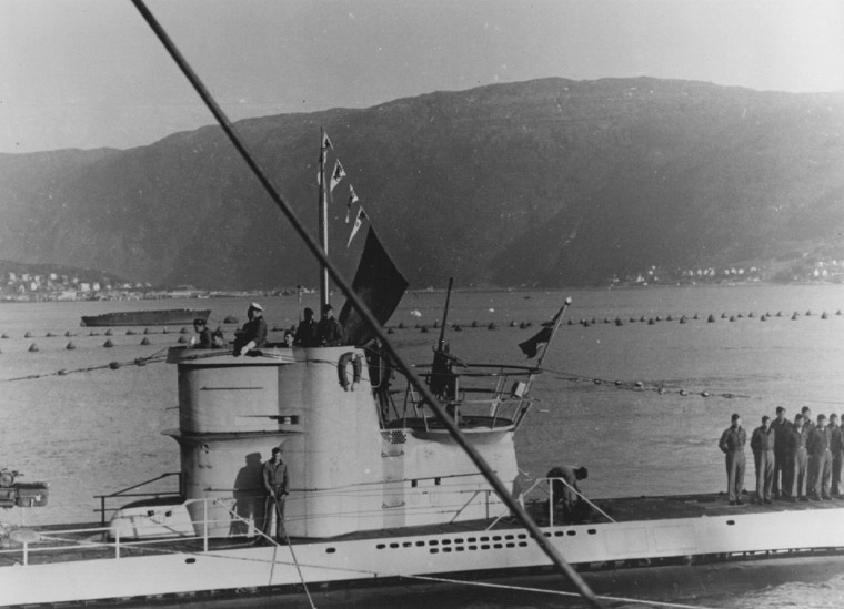 U255 Flying four victory pennants following its attack on convoy PQ17