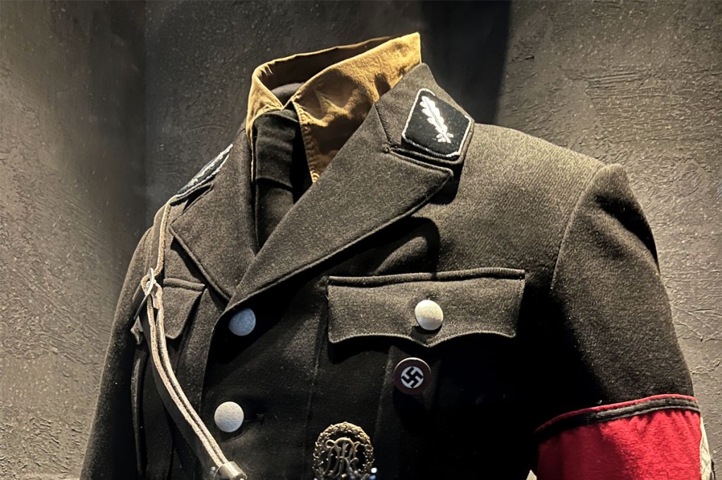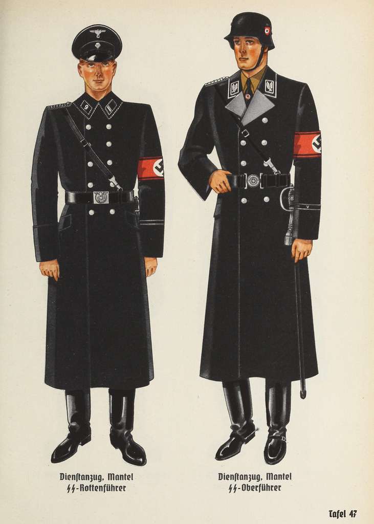 The sharp, sinister lines of the SS uniform demonstrate the dangerous intersection of style and ideology, where aesthetics served oppression.