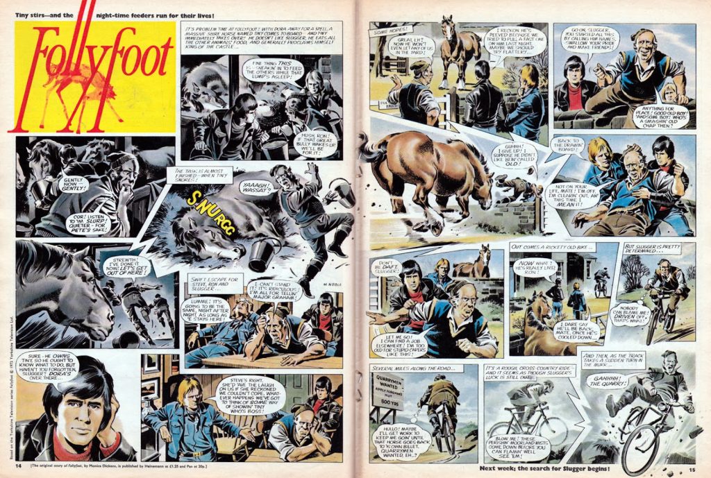 (Left) ‘Follyfoot’ – just one of Look-In’s popular cartoon strip/TV tie-ins.