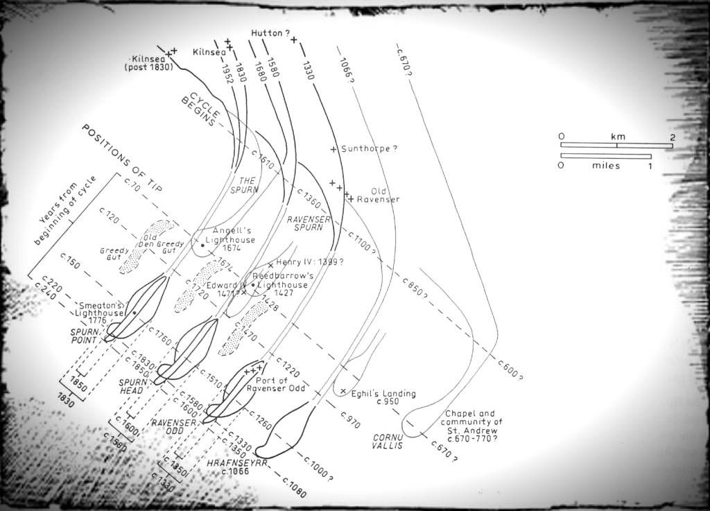 It is little wonder that the island rose in that location, for we can see from the shape of Spurn Head that the well-known landmark had itself been created by the sea’s currents. Beyond its sickle-shaped curve the island later known as Ravenser Odd [also known in some accounts as Ravensere, Ald Ravenser, Ravensburgh and Ravensspurn] was formed.